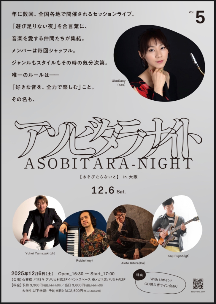 【出演】 UkoSaxy (sax)、Yuhei Yamazaki(dr),Robin(key),Koji Fujino(gt),Akito Kihira(ba)